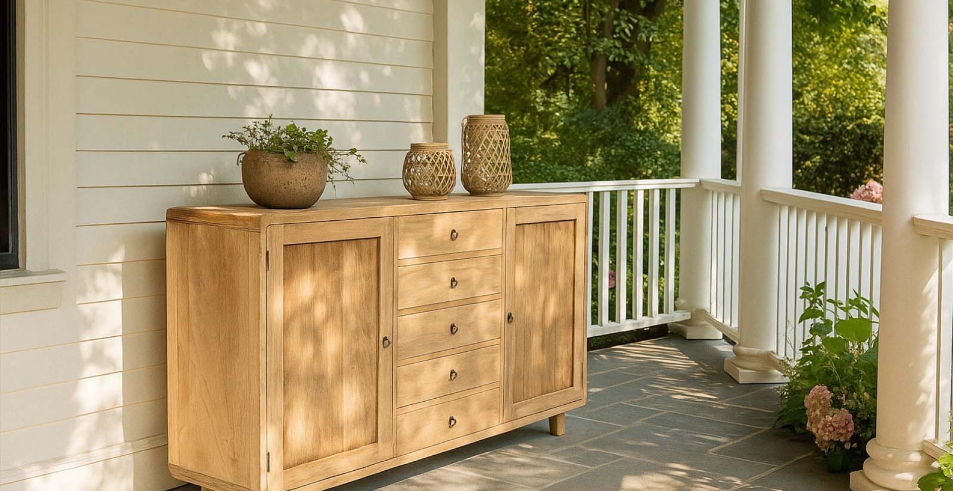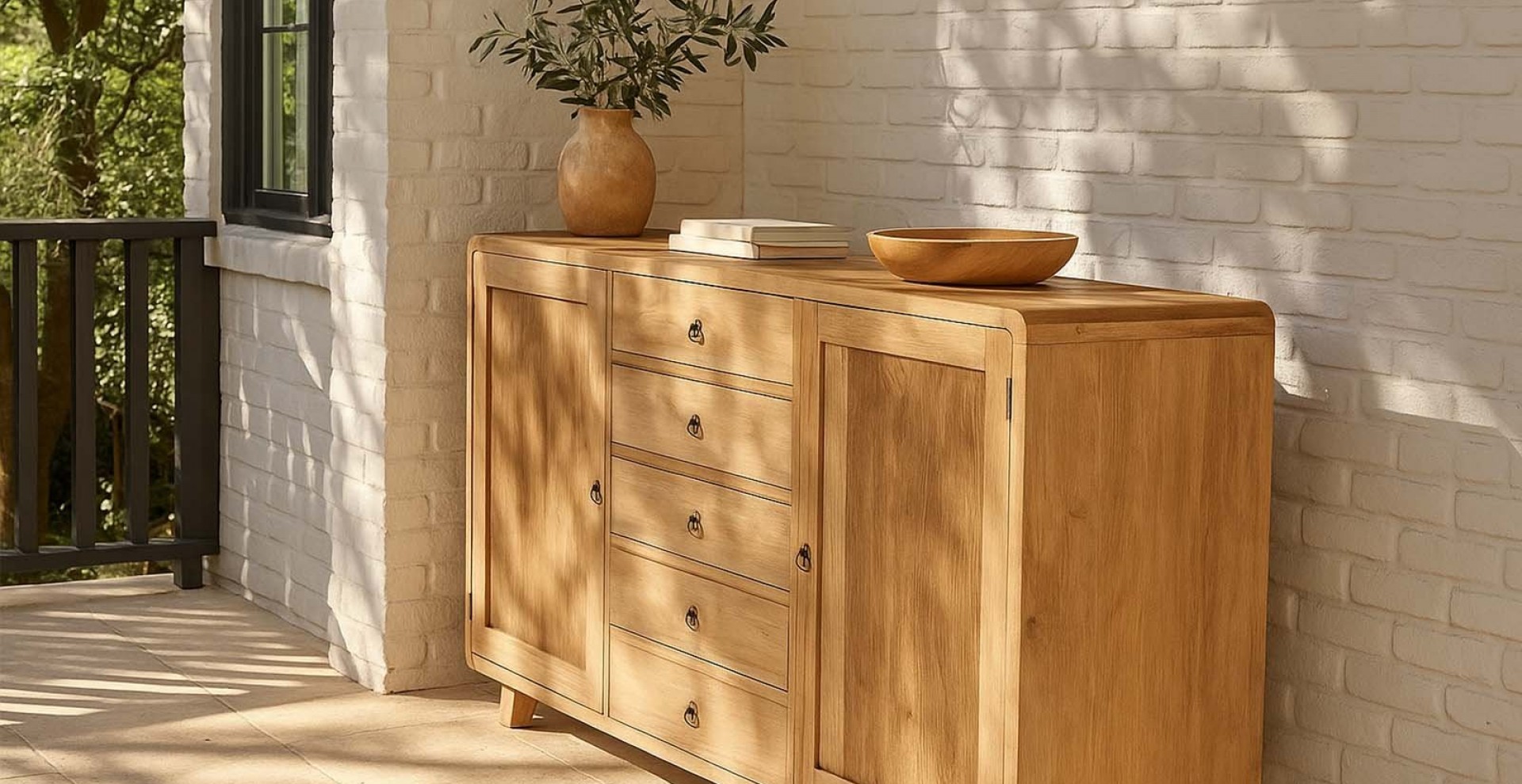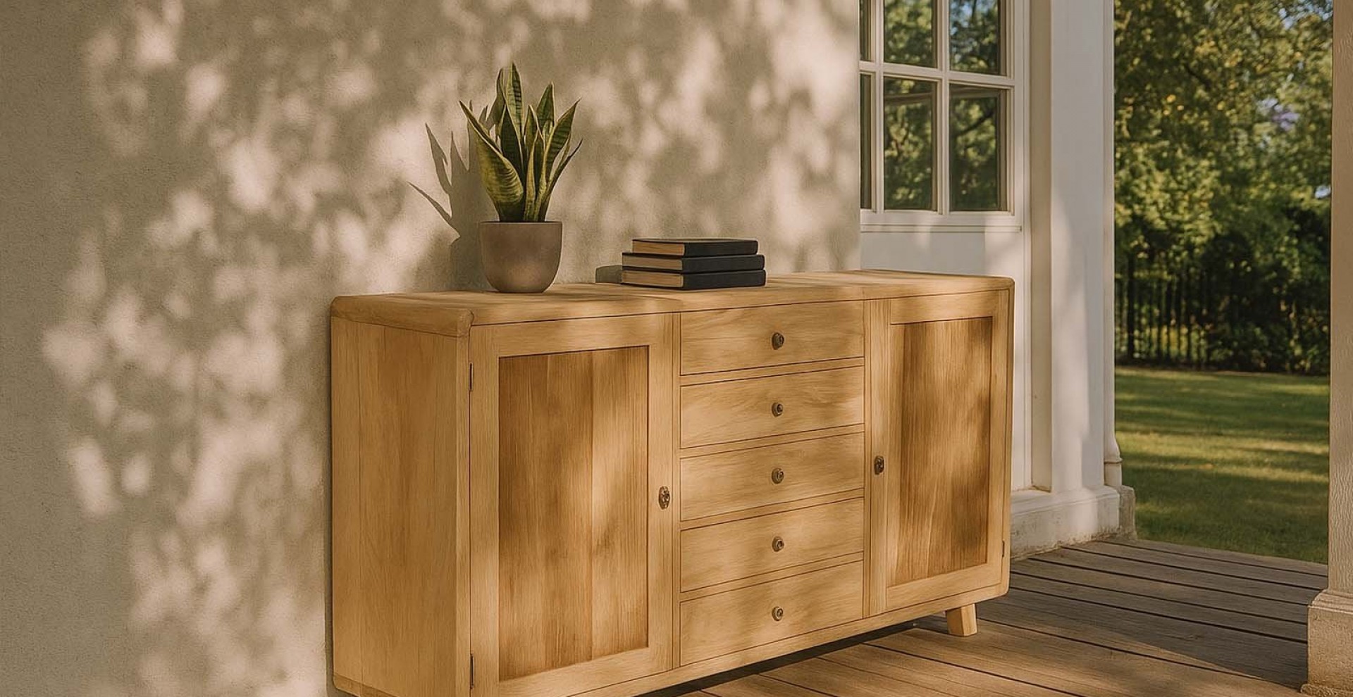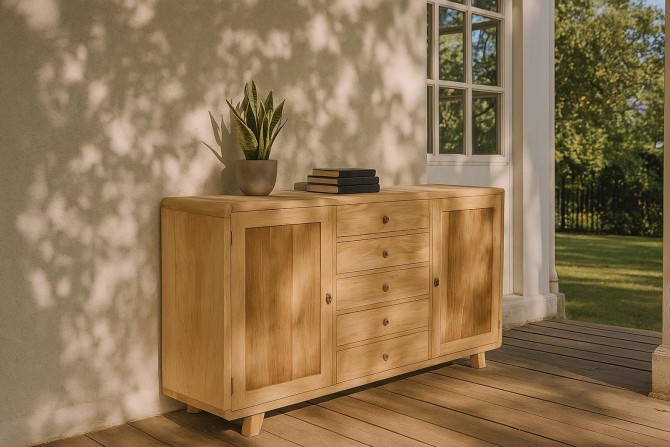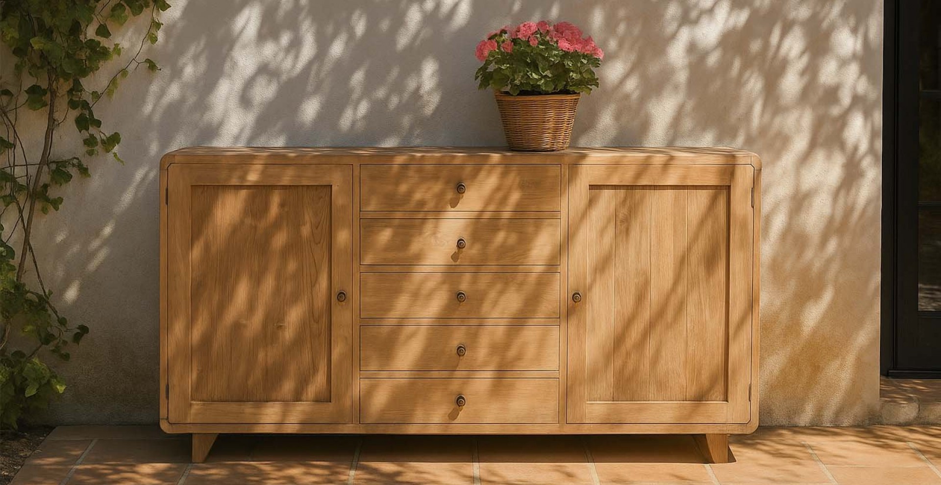 Die schicke Anrichte Lemari sorgt für eine gemütliche Stimmung und wohnliche Atmosphäre im Essbereich, Schlafzimmer und Wohnzimmer. Aber auch im Garten und auf der Terrasse.