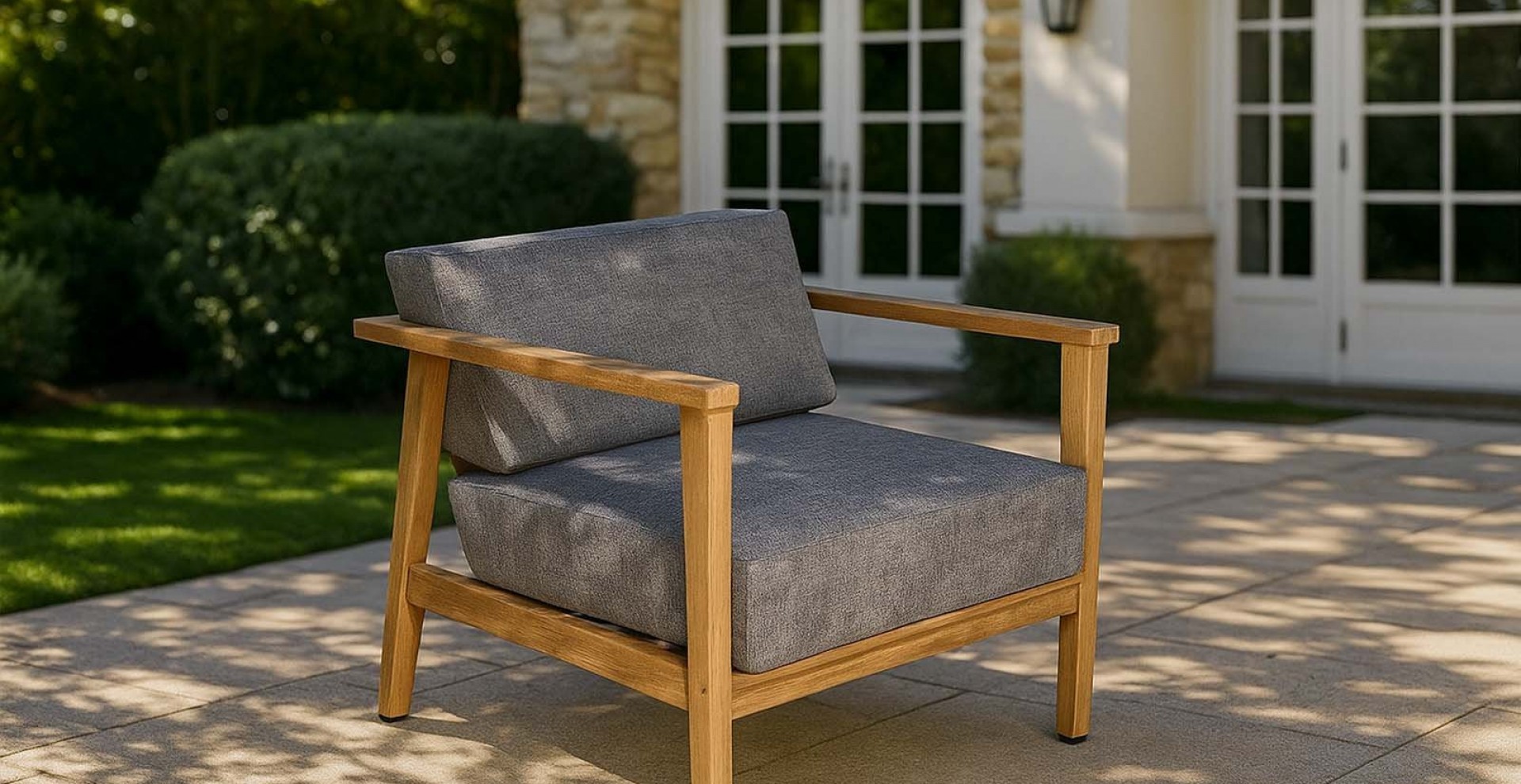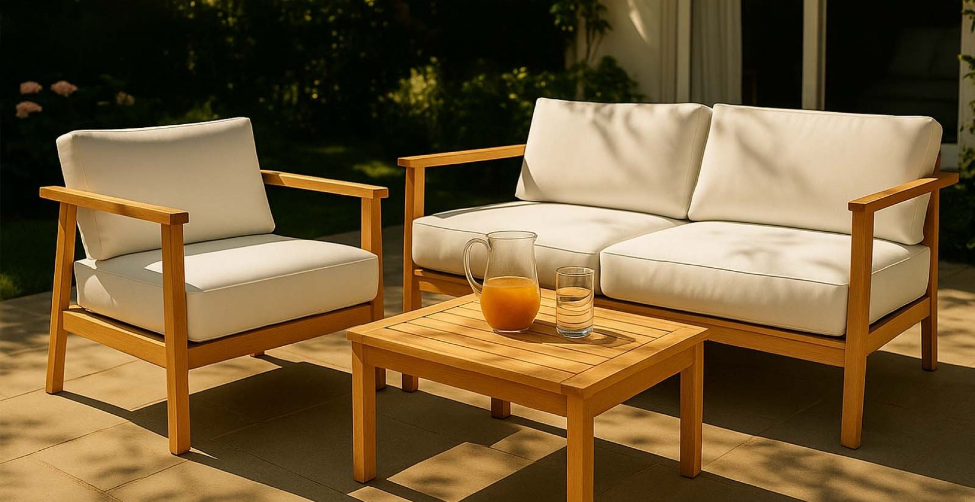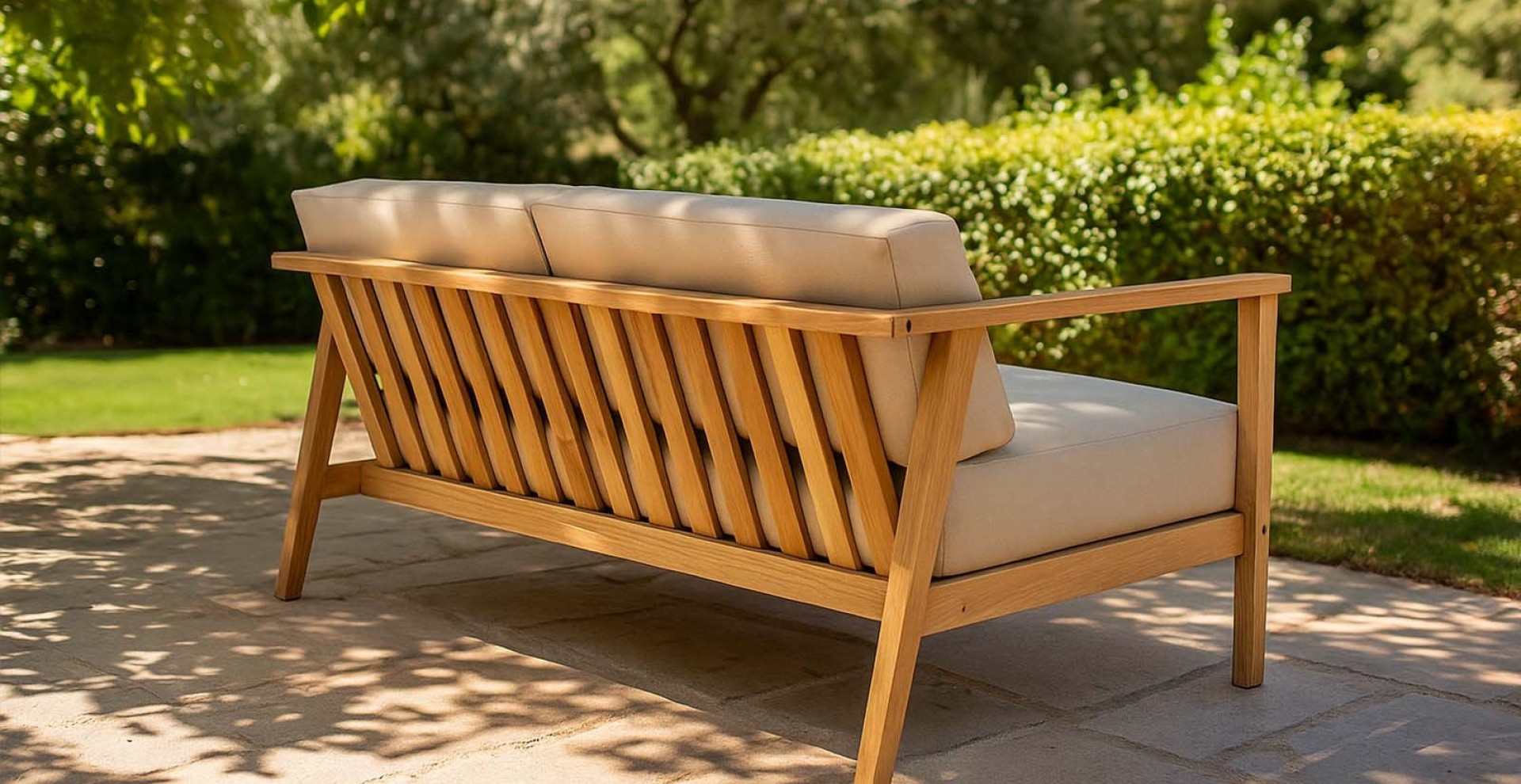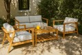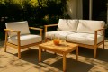 Das Gestell besteht aus 100% Plantagenteak, natürich ist es dementsprechend 365 Tage Wetterfest. Die Polsterung ist aus schmutzabweisendem, pflegeleichtem Stoff genäht und kann gewaschen werden.