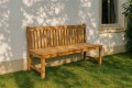 Ausführung der Rückenlehne in vertikaler Lattung mit massivem, horizontalem Abschlußbalken. Sitzflächen-Lattung in Längsrichtung, vierfach gelagert. Die Seitenteile in Bodennähe sind zusätzlich mit einem stabilem Quersteg verstärkt. Sämtliche Verschraubungen in Messing massiv.